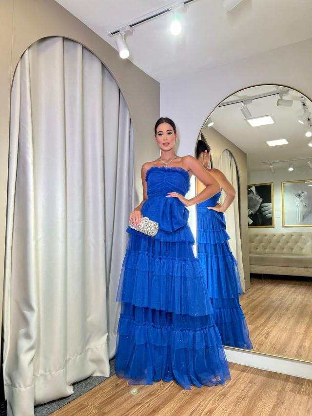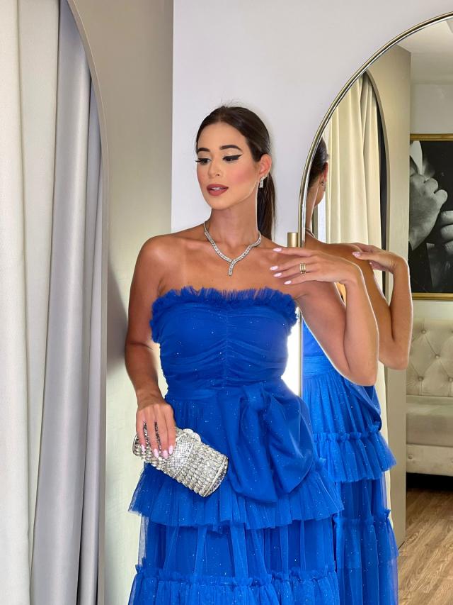 Vestido Azul Royal de tule com glitter tomara que caia