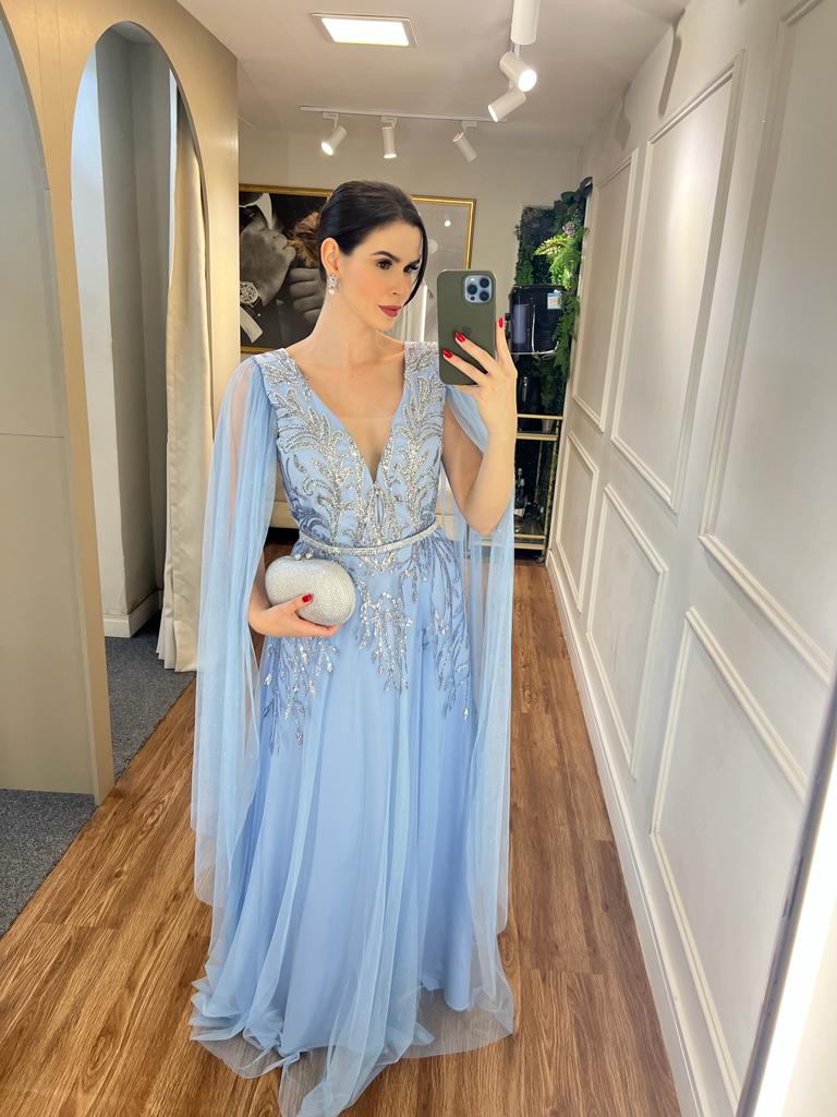 Vestido Azul Serenity bordado com capas mãe de noiva