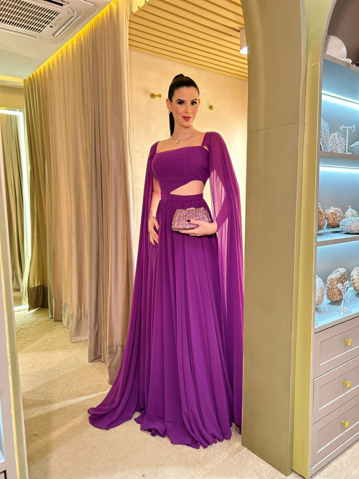 Vestido Fucsia fluído com capas e recortes