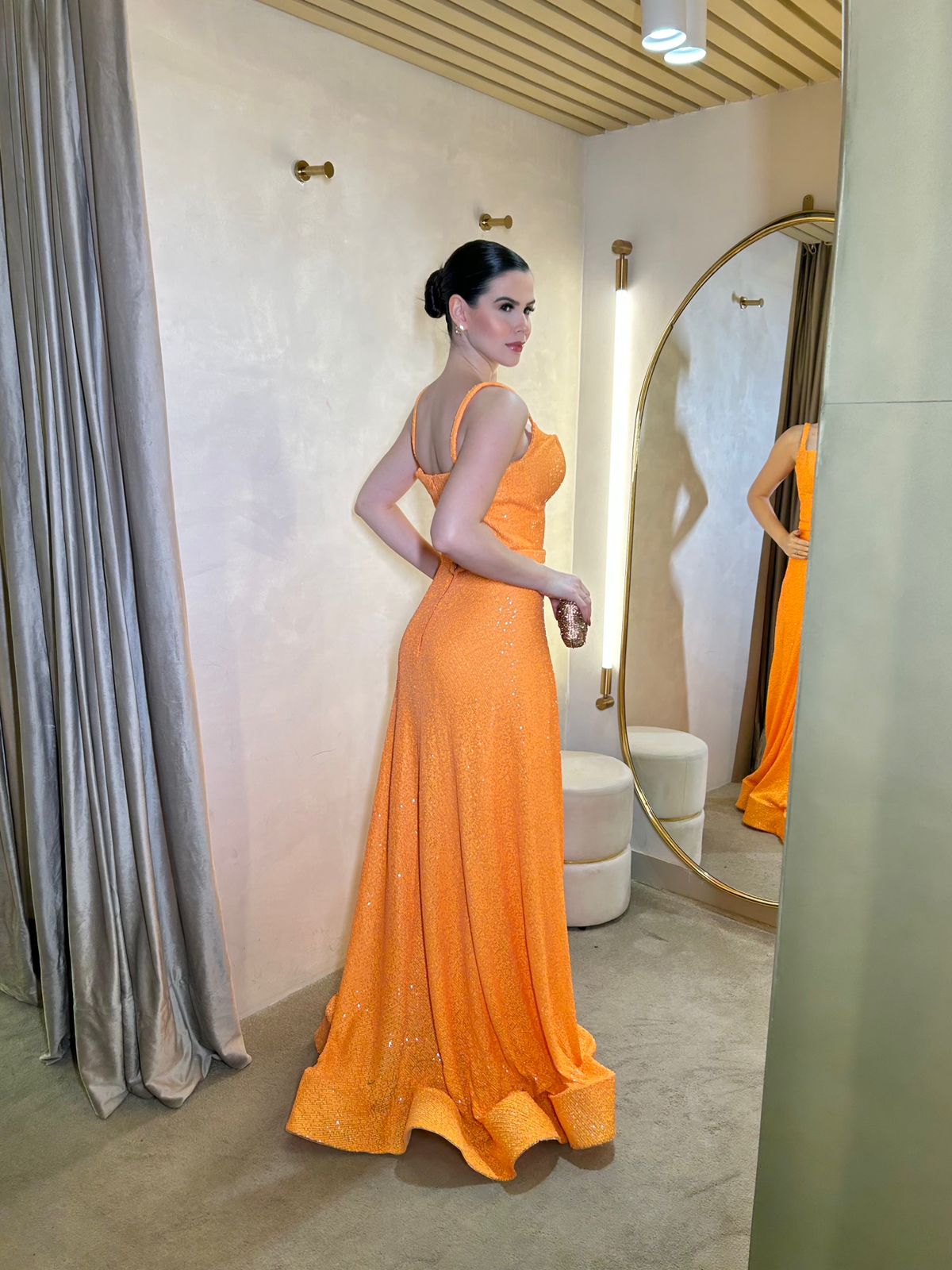 Home Produtos Vestido Laranja de paetê com crinol na barra