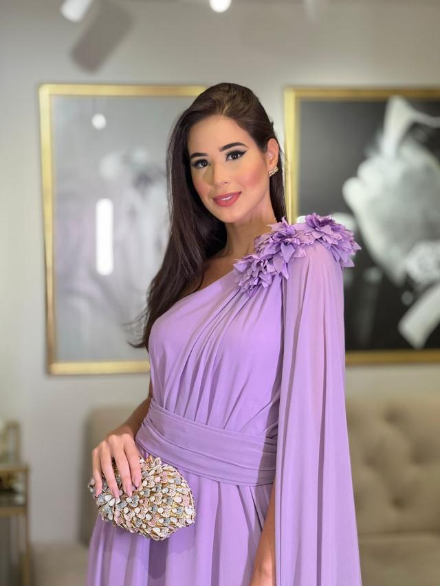 Vestido Lavanda com capa unilateral e aplicações de flores