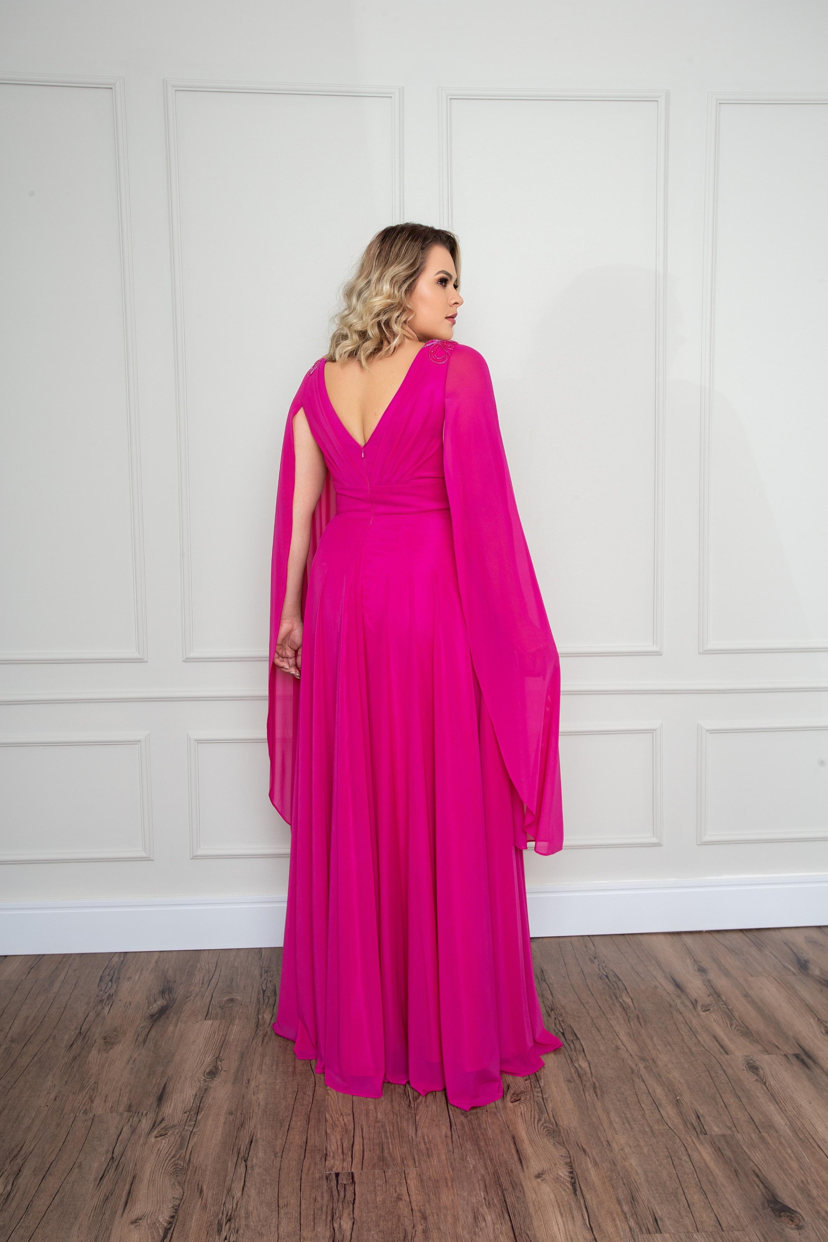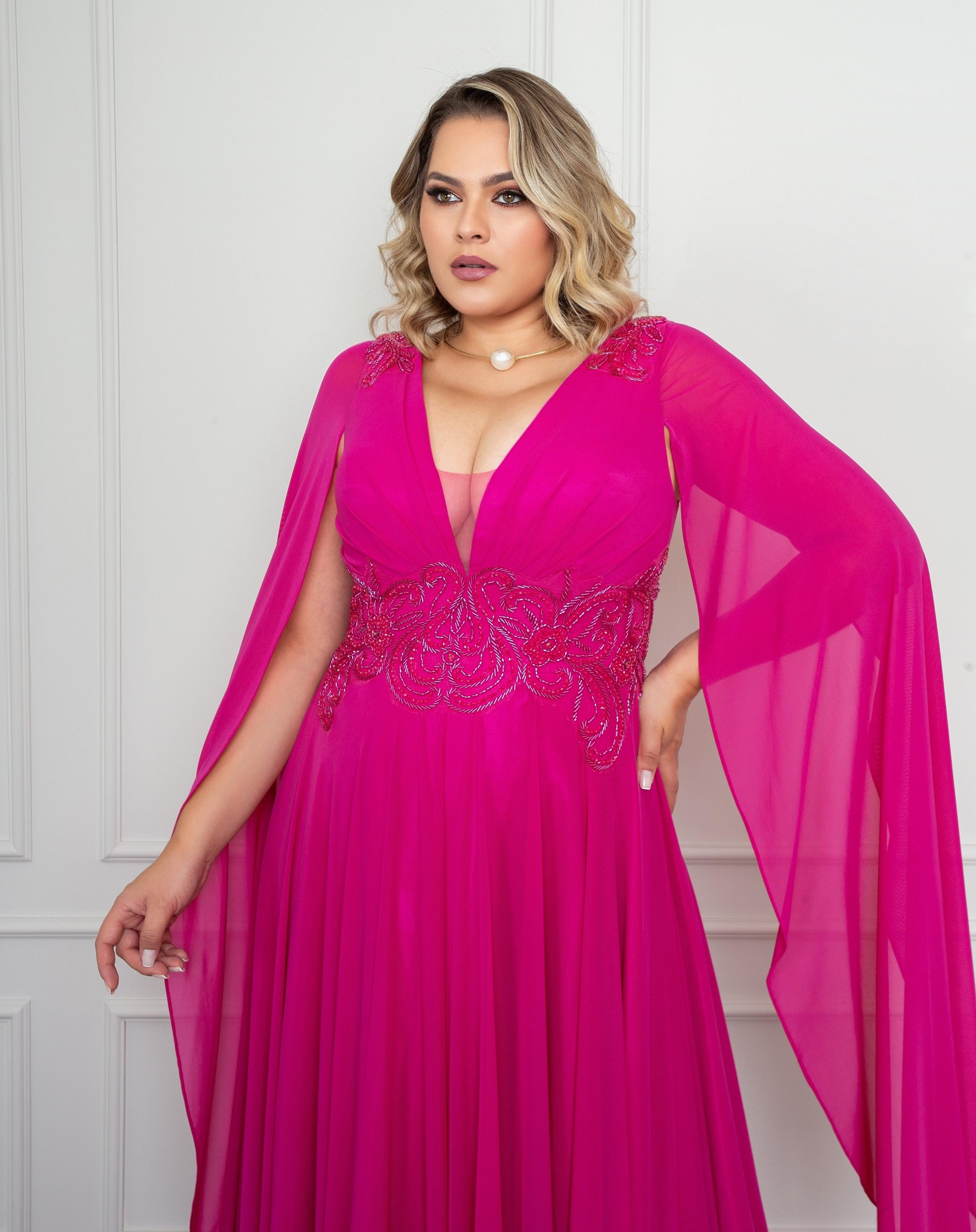 Home Produtos Vestido Pink fluído com bordados e capas