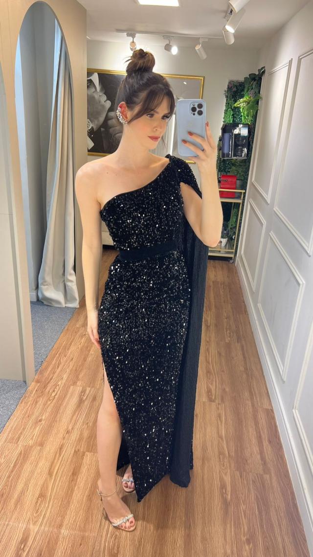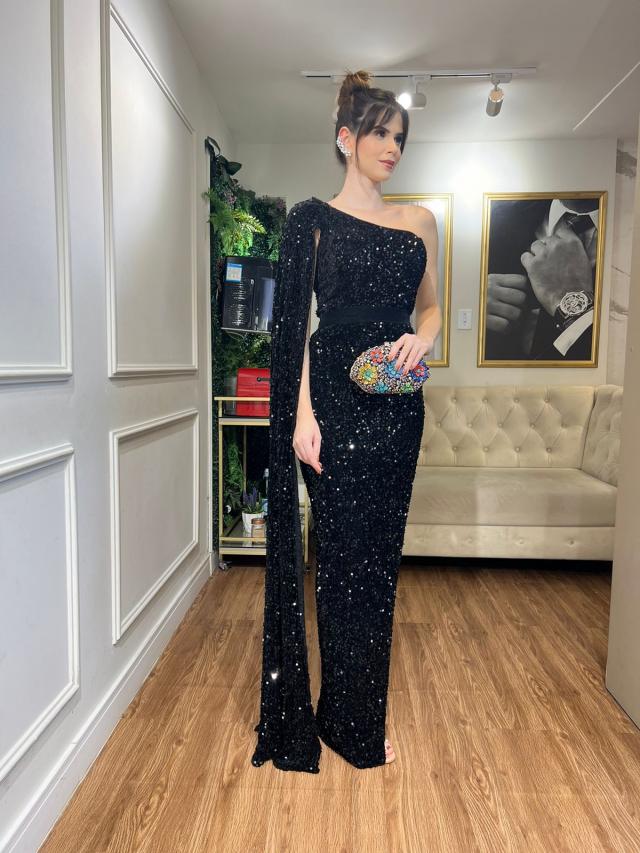 Home Produtos Vestido Preto de paetê com capa e fenda