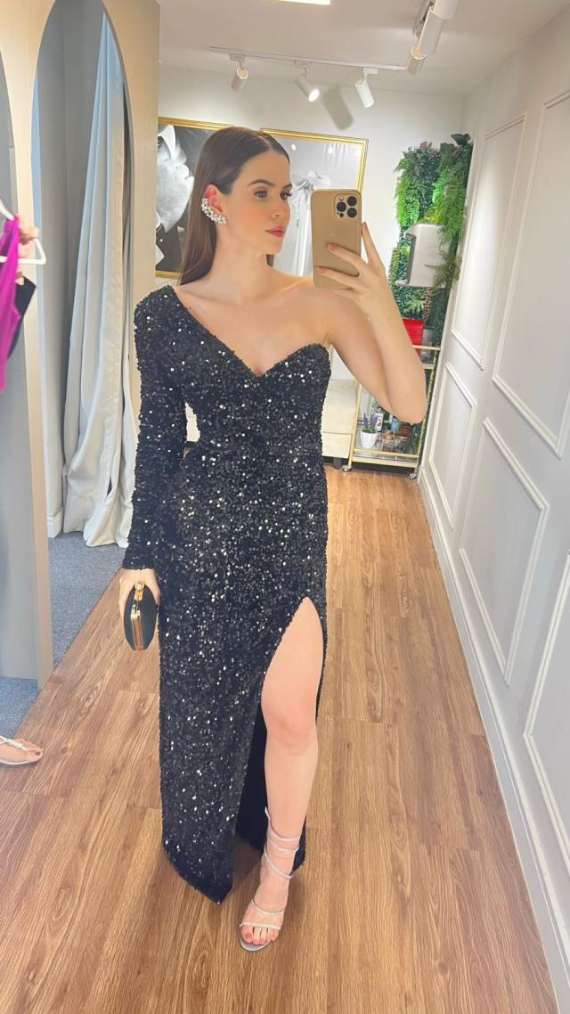 Home Produtos Vestido Preto paetê nula manga com fenda