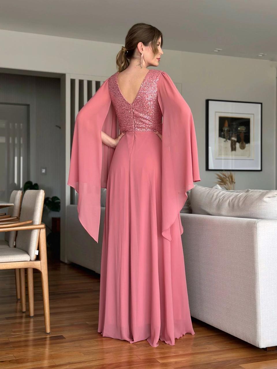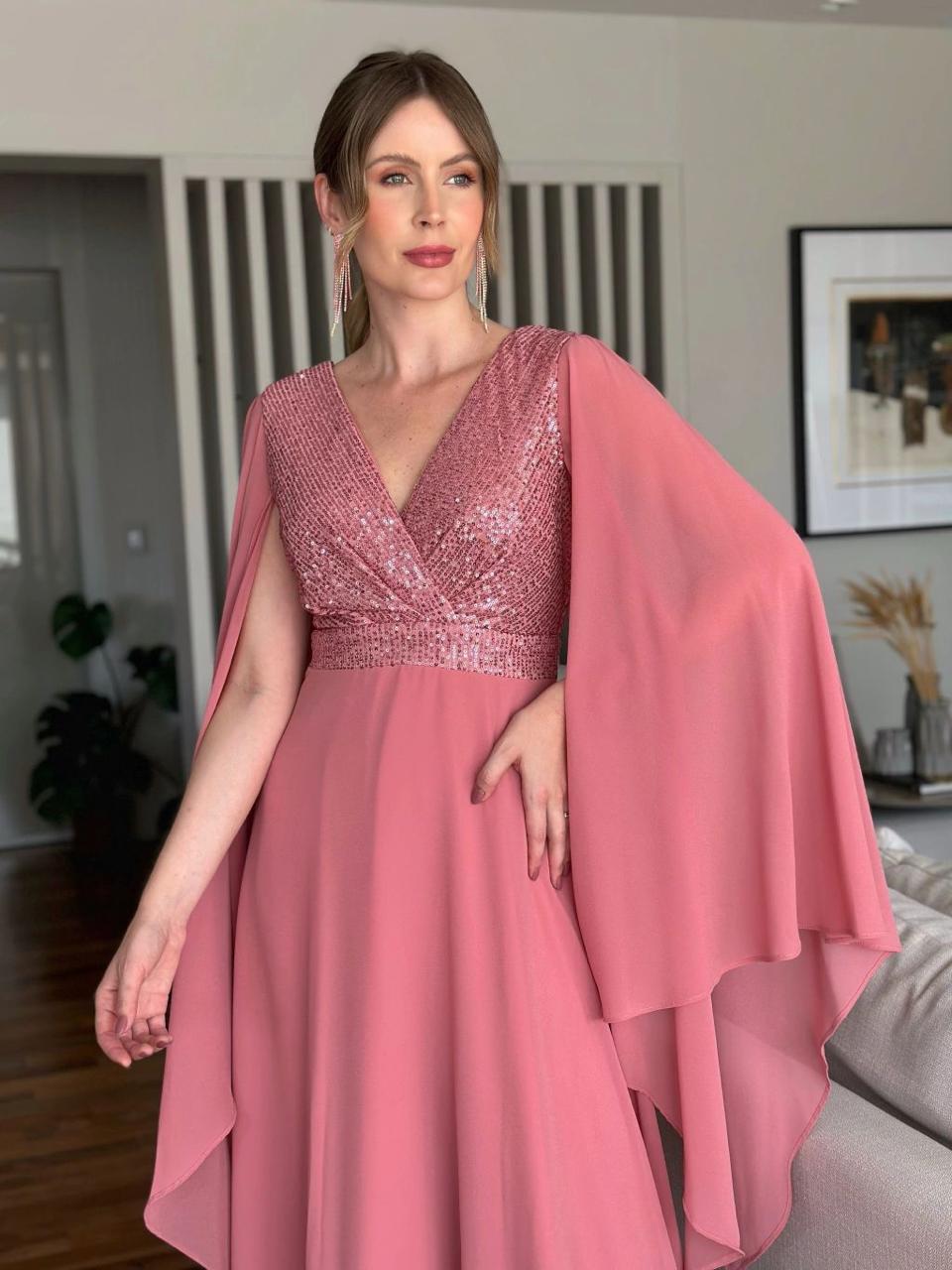 Vestido Rosa canela fluído com capas