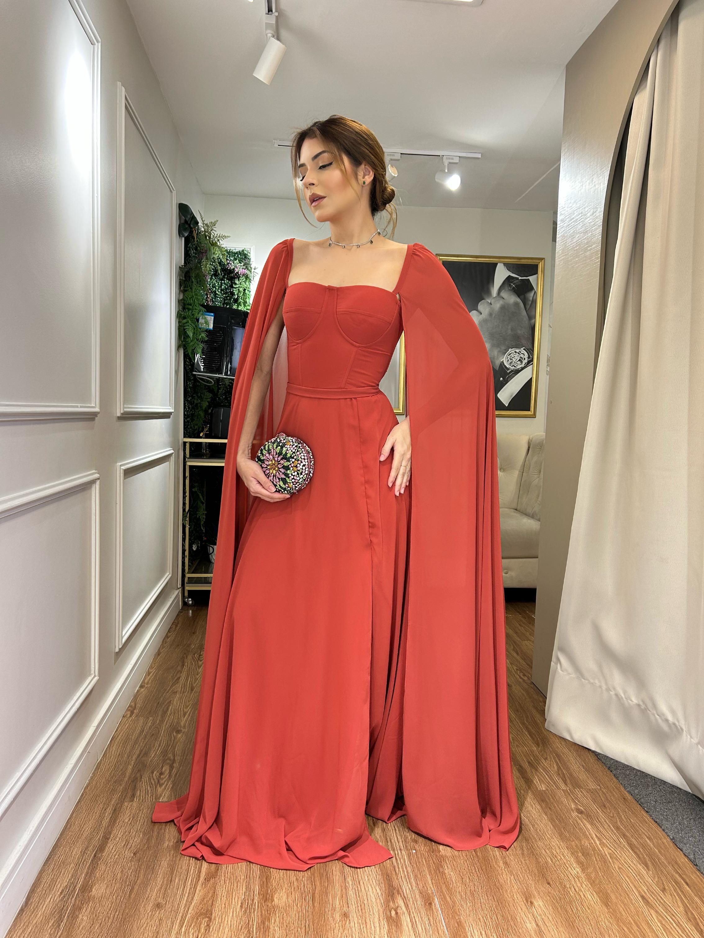 Home Produtos Vestido Terracota fluído com corpete e fenda