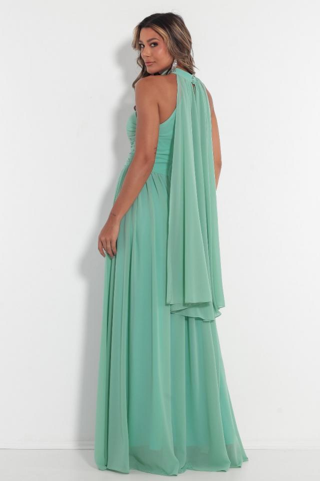 Vestido Verde Menta tomara que caia fluído com capa e fenda